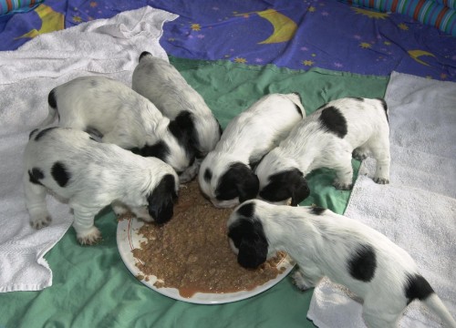 Zusätzlich zur Muttermilch gibt es jetzt täglich mehrmals Welpenbrei.